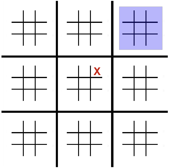 Om X spelade i det övre högra hörnet i ett litet rutnät, måste O spela i det övre högra lilla rutnätet i det globala rutnätet (blåmarkerat).