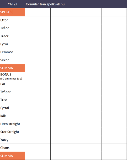 Ta fram 5 tärningar och 1 formulär för varje spelare.